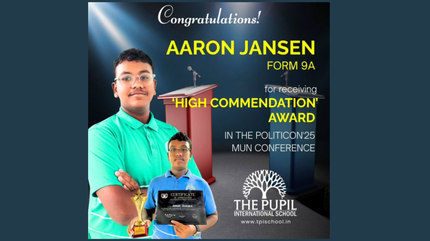 Congratulations to Aaron Jansen of Form 9 for receiving the ‘High Commendation’ Award at the Politicon ’25 MUN Conference, held at The Schram Academy on 1st and 2nd August 2025.