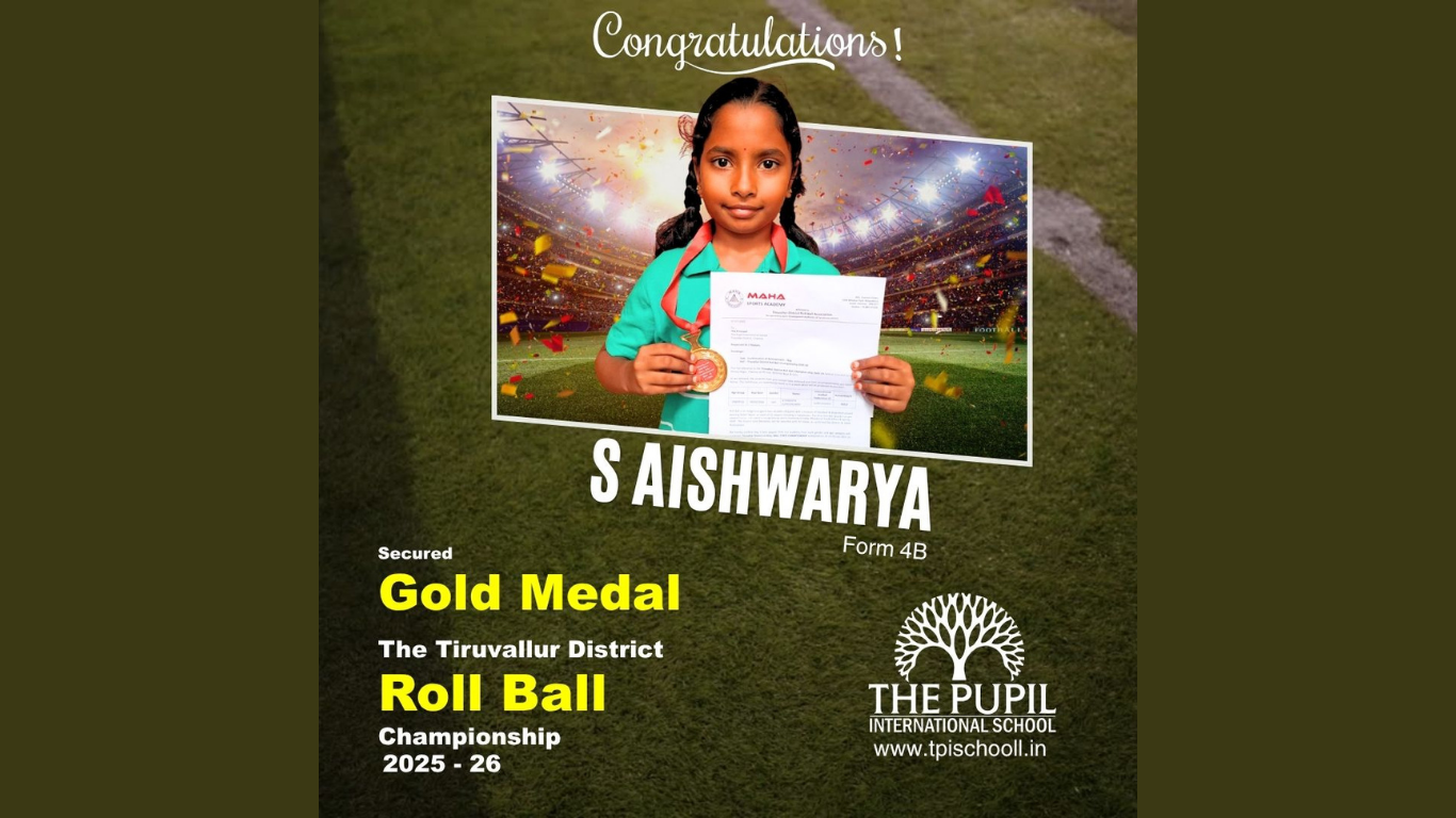 We are proud to share that Aishwarya S of Form 4B has secured the Gold Medal at the Tiruvallur District Roll Ball Championship 2025–2026. Her remarkable achievement is a testament to her dedication, discipline, and perseverance.