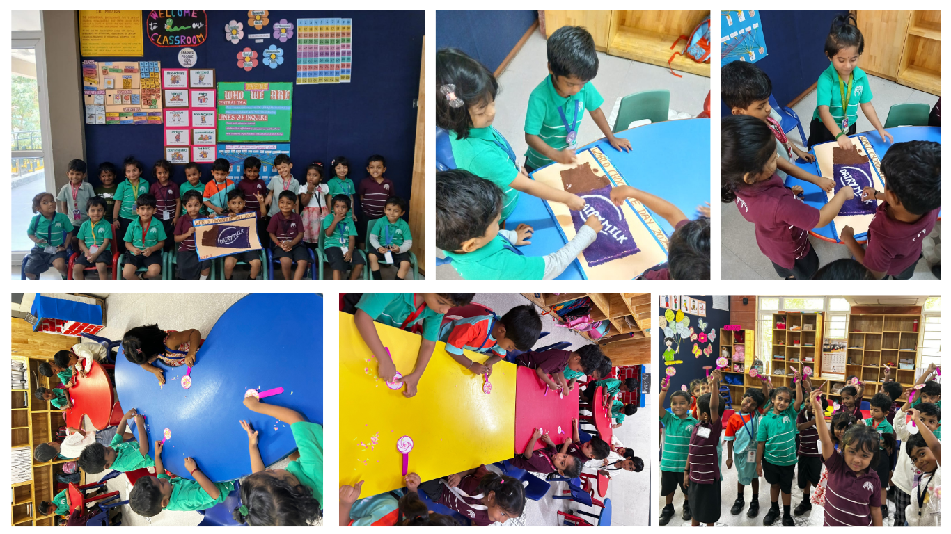 They crafted colourful paper lollipops using bits of paper and glue, showcasing their creativity and fine motor skills. Another highlight was decorating chocolate-themed designs with rangoli powder, which added vibrant texture and depth to their artwork. Students also participated in a Candy Wrapper Designing activity, imagining unique, eco-friendly wrappers that reflected their sweet and artistic ideas.